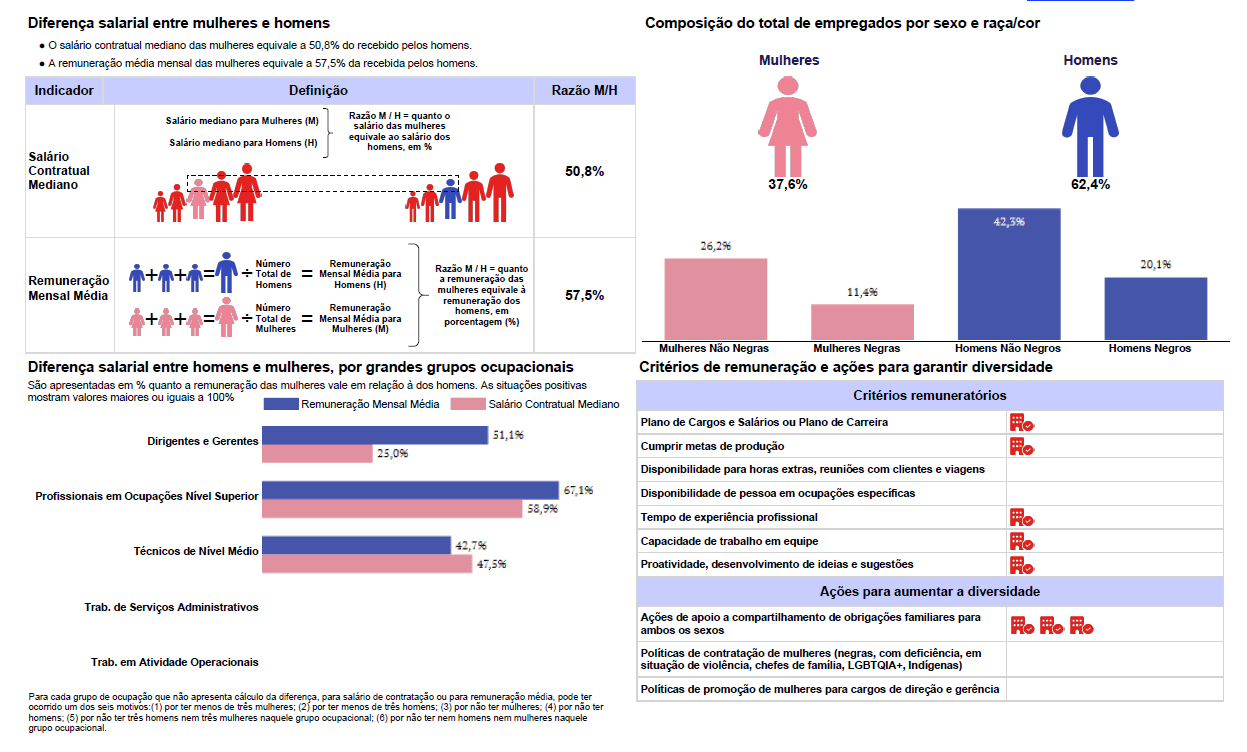 Em cumprimento a Lei nº 14.611/2023, neste ato divulgamos o relatório do MTE, para demonstrar o nosso compromisso com a transparência, sendo que estamos lidando com dados parciais, os quais não englobam a integralidade dos colaboradores e colaboradoras do nosso Grupo.